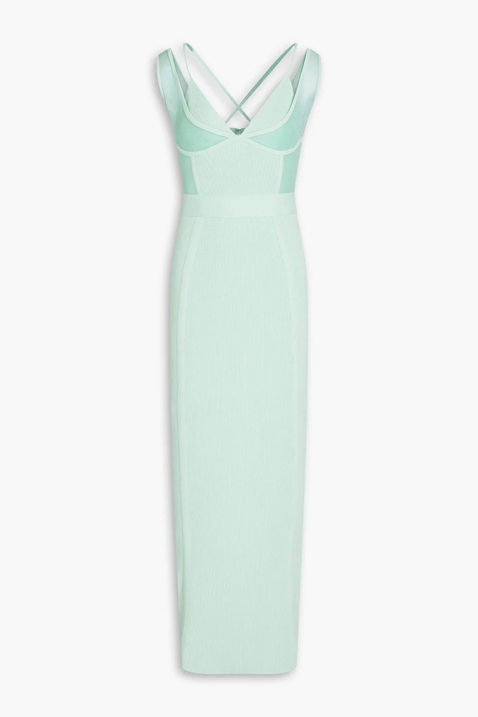 Dress bandage mesh trims crossover straps concealed hook and zip fastening at back mid-weight, slightly stretchy fabric dry clean imported 62% Recycled viscose 22% Nylon 14% Polyester 2% Spandex Product Code 1647597278194431