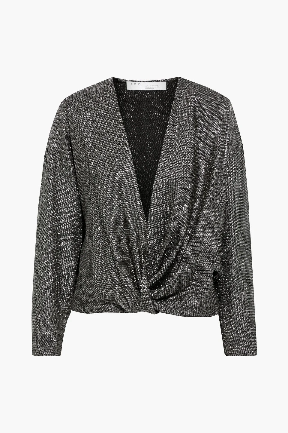 Blouse metallic silk-blend wrap-effect front shoulder pads zipped cuffs slips on non-stretchy fabric lightweight fabric dry clean imported 78% Silk 15% Metallic Polyester (Mp) 7% EcoVero™ Viscose Product Code 22250442026053612