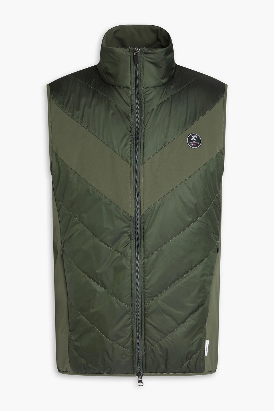 Vest stretch-shell quilted shell paneled zipped pockets two-way zip fastening through front fleece lining mid-weight, stretchy fabric machine wash or dry clean imported Just here for the apres games? We see you. Bag this style for a look as cool as the slopes and toasty as the fire. There’s more from We Norwegians here. 72% Polyamide 20% Merino Wool 8% Elastane Product Code 46376663162949755