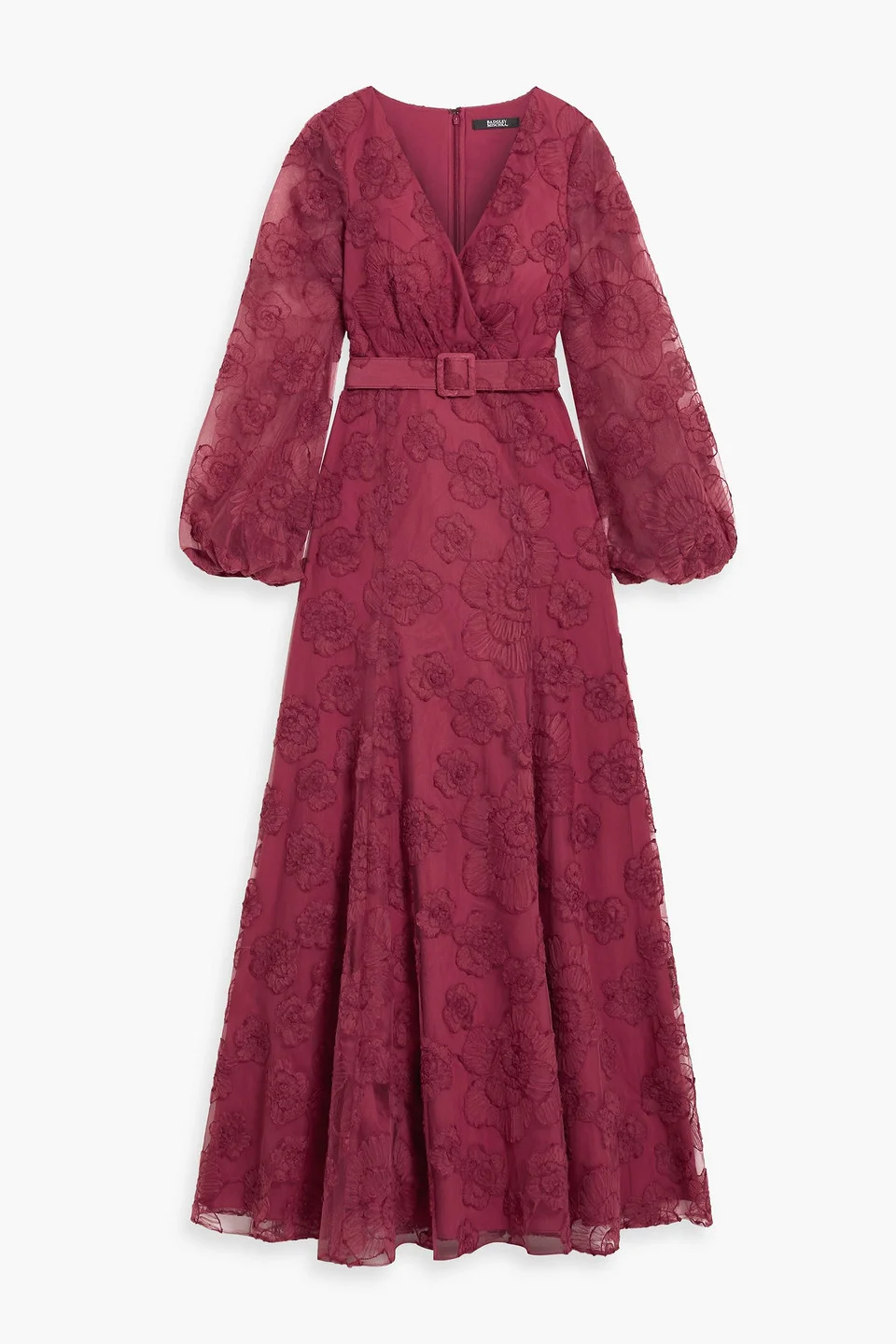 Gown tulle embroidered detachable belt puffed sleeves concealed hook and zip fastening at back fully lined lightweight, non-stretchy fabric dry clean imported Badgley Mishka’s burgundy tulle gown is embroidered with a swirling floral pattern – the overall effect is tres romantique . The sleeves are gently puffed and unlined, adding to it’s ethereal quality, with a belted wrap-effect bodice that’s so flattering. Keep things sophisticated with tonal accessories and clean beauty. 100% Polyester Product Code 46376663162965520
