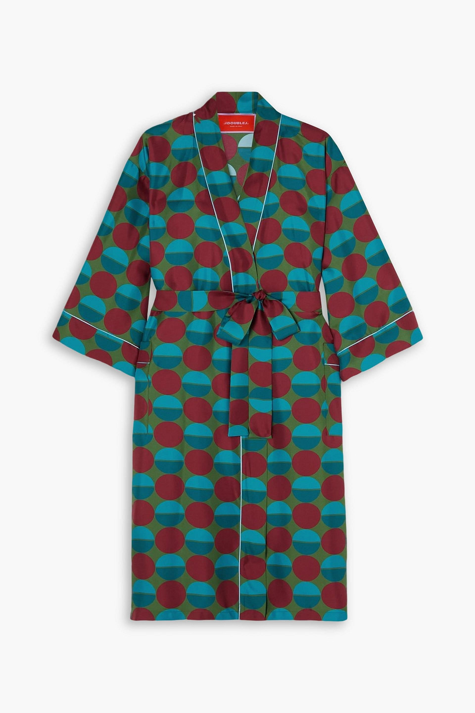 Robe printed silk-twill piped trims detachable waist tie front patch pockets slips on mid-weight, non-stretchy fabric dry clean made in italy La DoubleJ's in-house prints are inspired by Renaissance-era maximalism. This robe is cut from fluid silk-twill patterned with the brand's signature geometric motif. Whether you're relaxing at home or on vacation, it's a luxurious way to cover up. 100% Silk Product Code 46376663162956931