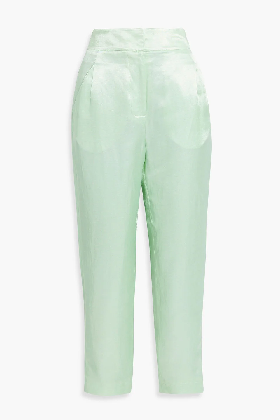 Tapered pants satin-twill back welt pocket two front slant pockets high-rise cut concealed hook and zip fastening at front non-stretchy fabric lightweight fabric machine wash imported 51% Rayon 27% Linen 22% Viscose Product Code 1647597325043440