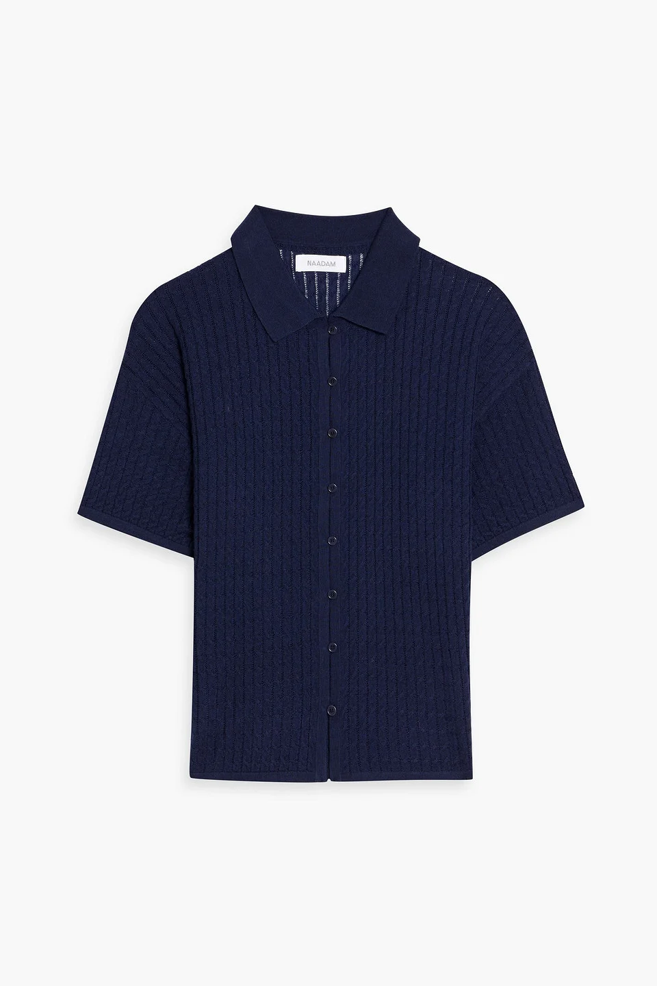 Polo sweater cable-knit merino wool and silk-blend pointelle trims button fastenings through front mid-weight knit dry clean imported 75% Merino Wool 25% Silk Product Code 46376663163082634