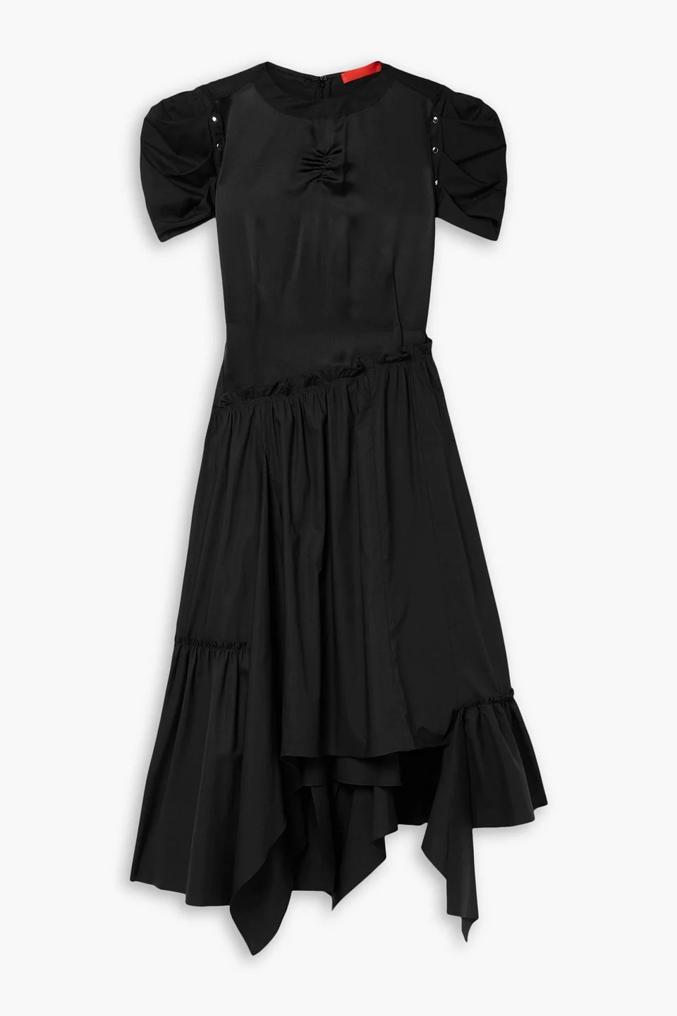 Dress cotton-poplin silk-satin paneled studded gathered ruffled asymmetric hem concealed hook and zip fastening at back mid-weight, non-stretchy fabric dry clean Commission's 'Canyon' dress is a cool take on a classic black style, thanks to the mixed media design. Cut in it a floaty silhouette, it's made from crisp cotton-blend poplin and silk-satin with an asymmetric hem and studded detailing. Style yours with combat boots and a swipe of red lipstick. 96% Cotton 4% Polyurethane Product Code 1647597276180883