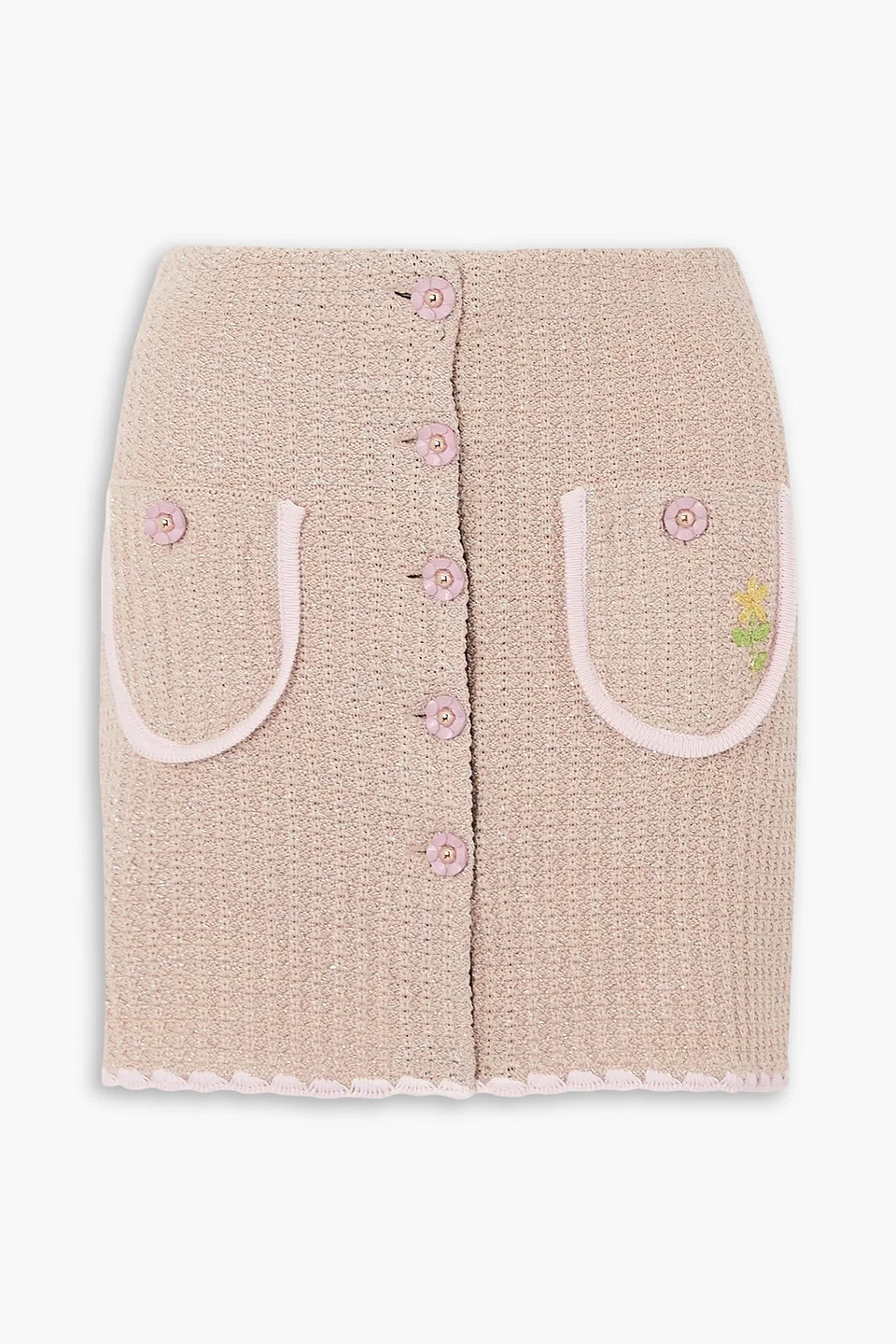 Skirt metallic crochet cotton-blend embroidered two front patch pockets button fastenings through front mid-weight knit dry clean made in italy Cormio's designs have a such fun and flirtatious feel. This 'Chiara' skirt is crocheted from cotton-blend that's flecked with silver threads and is sweetly embroidered with a flower on the pocket. Pair yours with a fitted tank and platforms. 50% Cotton 35% Viscose 8% Polyamide 7% Wire Product Code 1647597348550907