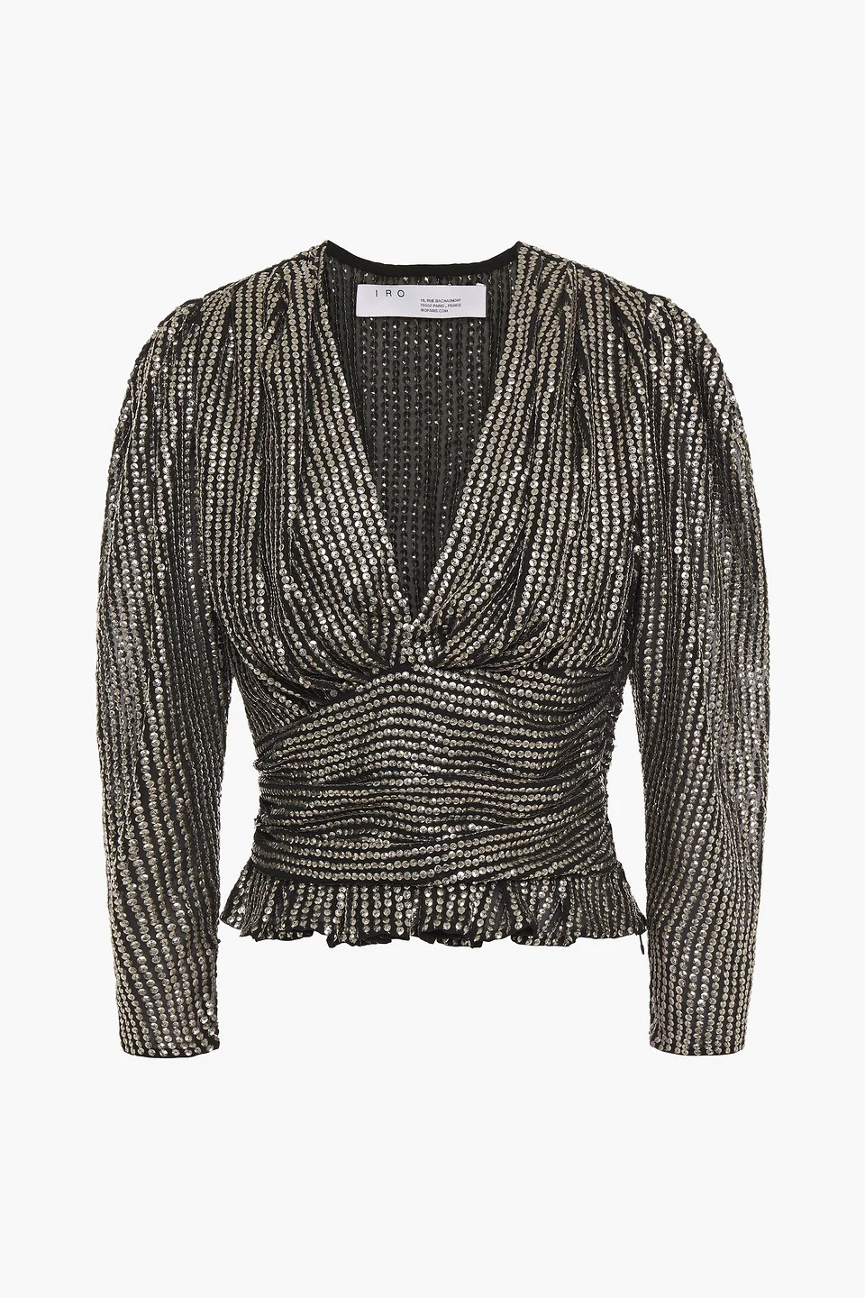 Top georgette sequins pleated detailing draped gathered sleeves concealed zip fastening along side partially lined non-stretchy fabric mid-weight fabric dry clean imported 100% Polyester Product Code 6630340696184749