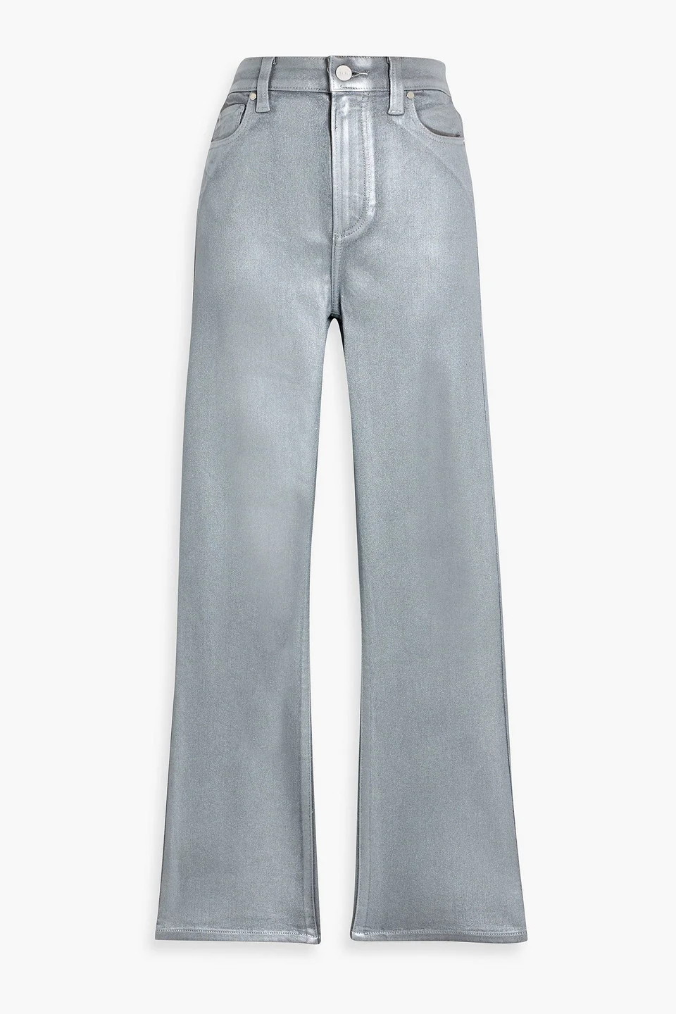 Kick-flare jeans metallic denim coated belt loops high-rise cut button and concealed zip fastening at front mid-weight, slightly stretchy fabric dry clean imported 52% Rayon 26% Cotton 21% Polyester 1% Spandex Product Code 46376663162996818