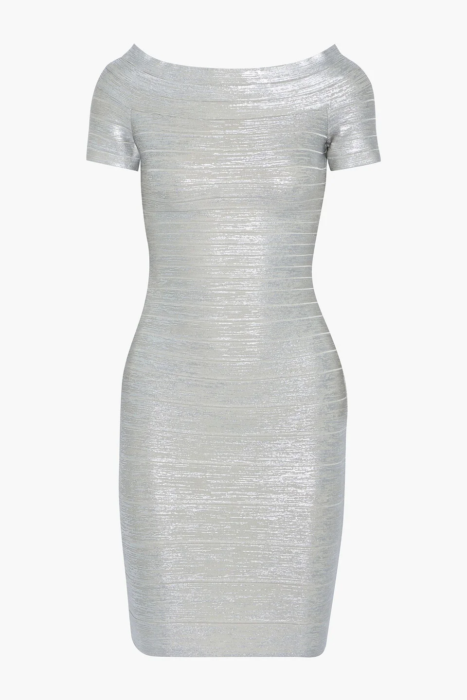 Dress bandage metallic coated concealed hook and zip fastening at back stretchy fabric mid-weight fabric hand wash imported 90% Rayon 9% Nylon 1% Spandex Product Code 38063312419528712