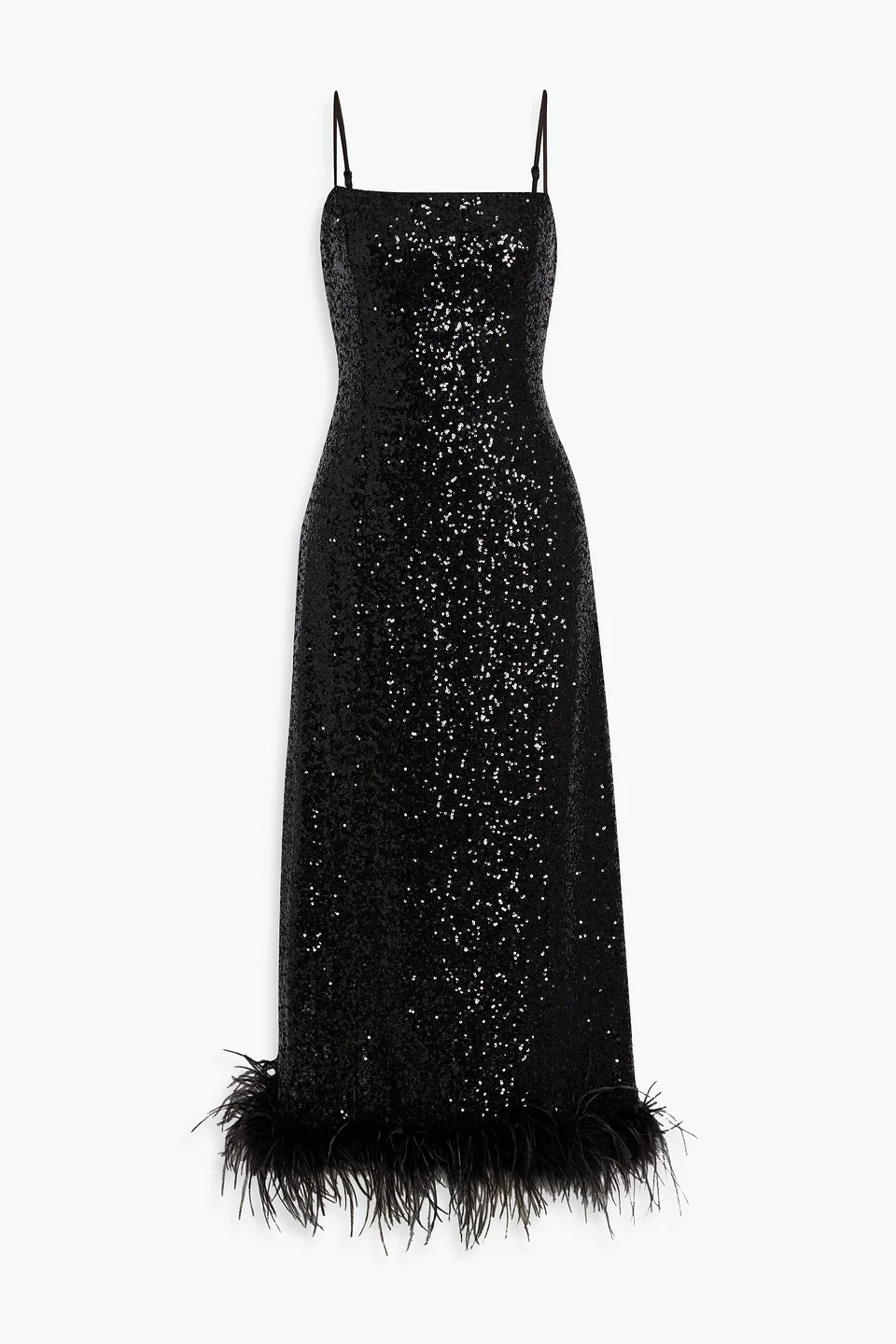 Dress tulle sequins feather trims adjustable straps back slit concealed zip fastening along back fully lined lightweight, heavily embellished fabric dry clean ostrich: china imported 95% Polyester 5% Spandex Product Code 46376663162898700