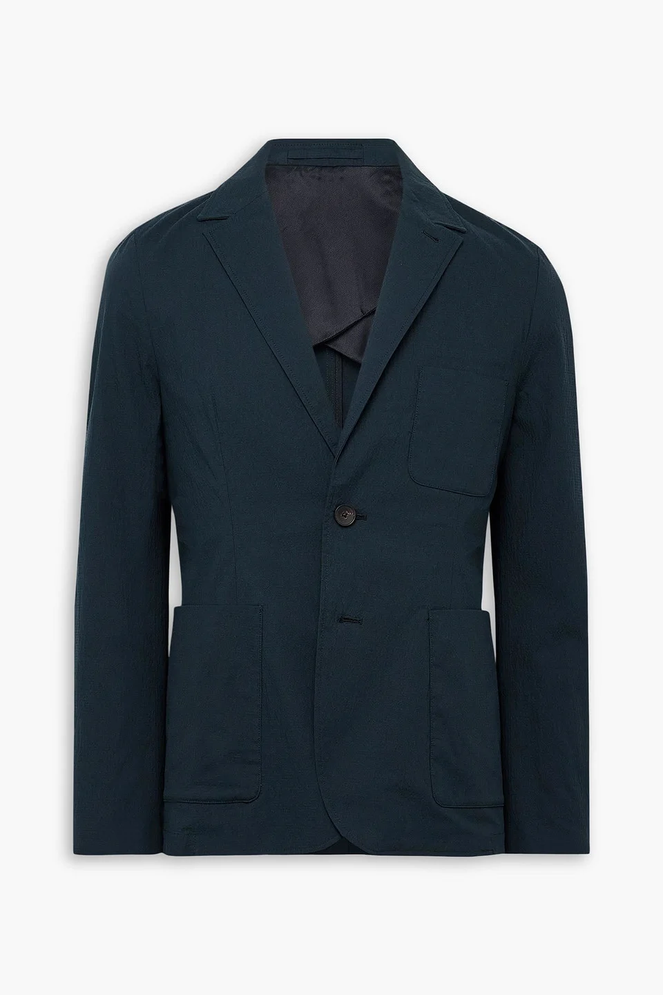 Suit jacket cotton-blend seersucker notch lapels chest pocket front patch pockets back vent partially lined buttoned cuffs button fastenings through front mid-weight, non-stretchy fabric dry clean imported 64% Cotton 35% Organic Cotton 1% Elastane Product Code 46376663163065177