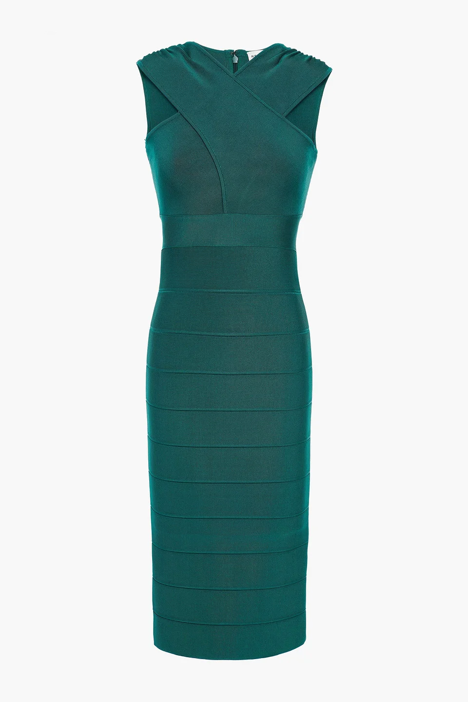 Dress bandage crossover front concealed hook and zip fastening at back back split stretchy fabric mid-weight fabric hand wash or dry clean imported 91% Rayon 8% Nylon 1% Spandex Product Code 38063312418064532
