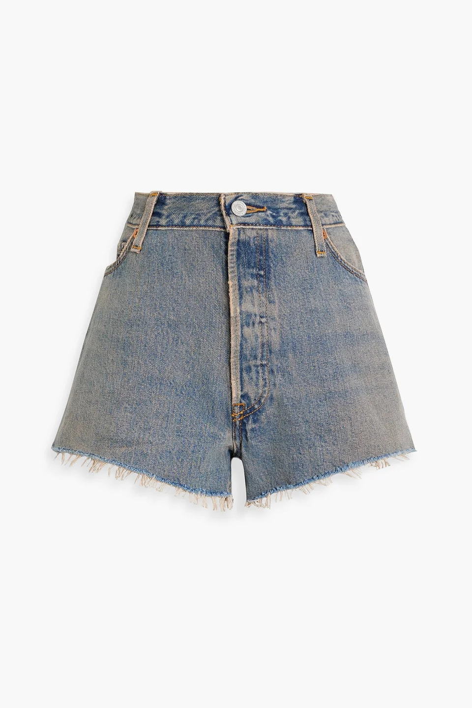 Shorts denim belt loops mid-rise cut five pockets frayed cuffs partially concealed button fastenings along front mid-weight, non-stretchy fabric machine wash every re/done style is uniquely distressed and finished, so may differ slightly to the item shown 100% Cotton Product Code 46376663162929071