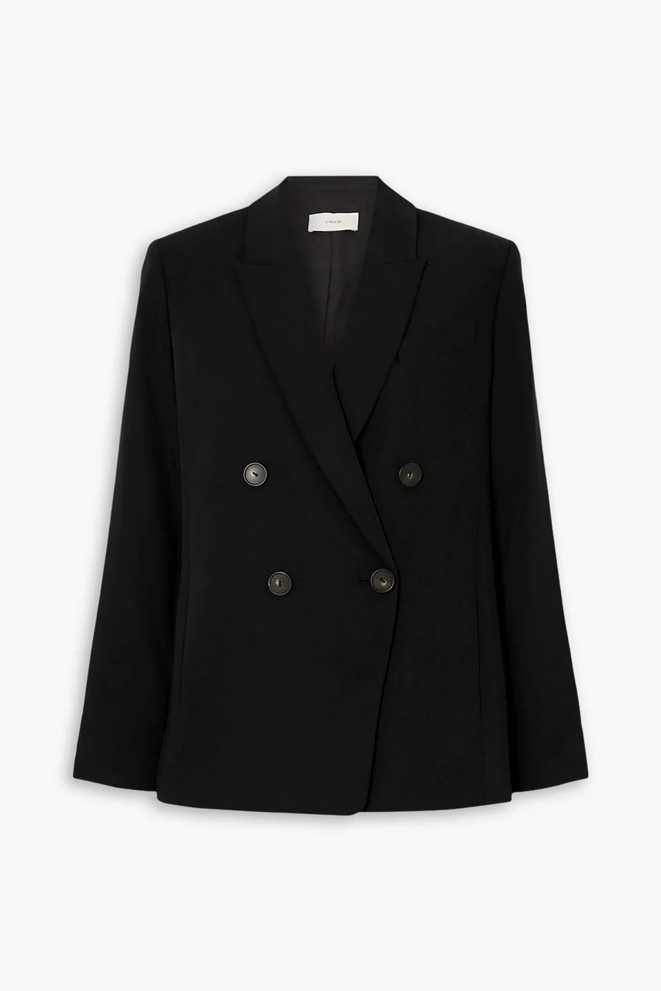 Blazer crepe shoulder pads breast pocket two front slit pockets button fastenings through double-breasted front fully lined back vent mid-weight, non-stretchy fabric hand wash or dry clean made in belgium Vince's black blazer is a classic style you'll turn to for years to come. Made from smooth crepe, it has a double-breasted front with peak lapels and on-seam pockets. The back vent allows for easy movement and layering. Wear yours with the matching pants or jeans. 100% Polyester Product Code 1647597349931463
