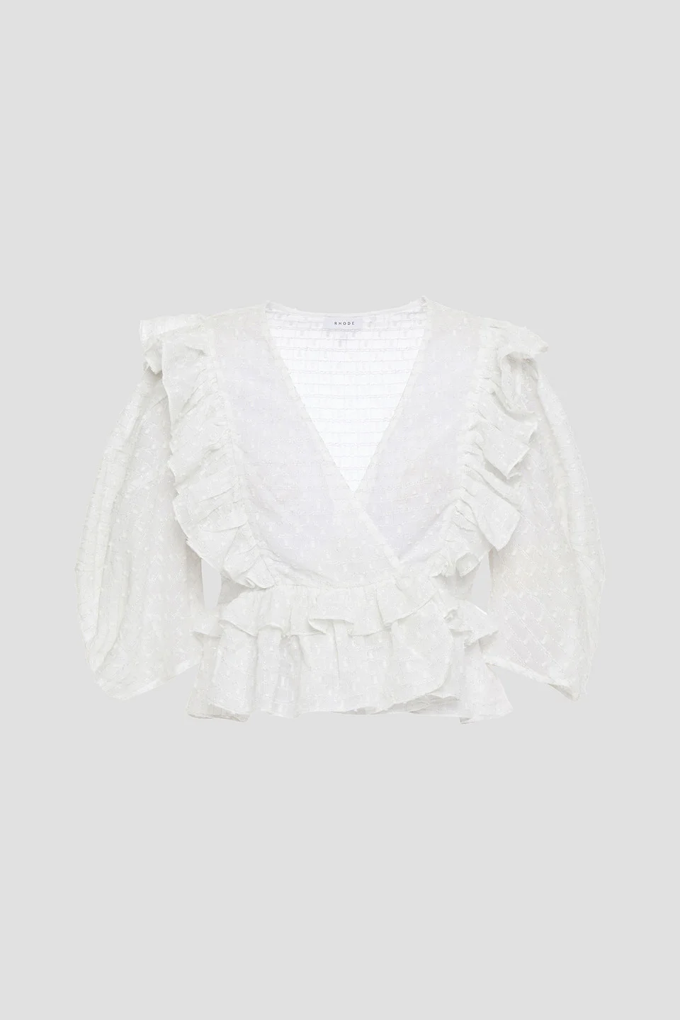 Wrap blouse metallic fil coupe cotton-blend gathered ruffled cropped concealed hook fastenings along front non-stretchy fabric lightweight fabric hand wash or dry clean imported 93% Cotton 7% Metallic fiber Product Code 2204324140160809