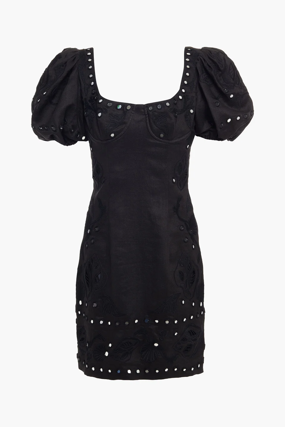 Dress gauze mirror embellishment embroidered internal boning lattice trims non-stretchy fabric mid-weight fabric gathered sleeves elasticated cuffs clasp fastening at back cutout dry clean made in italy 100% Ramie Product Code 20346390235475926
