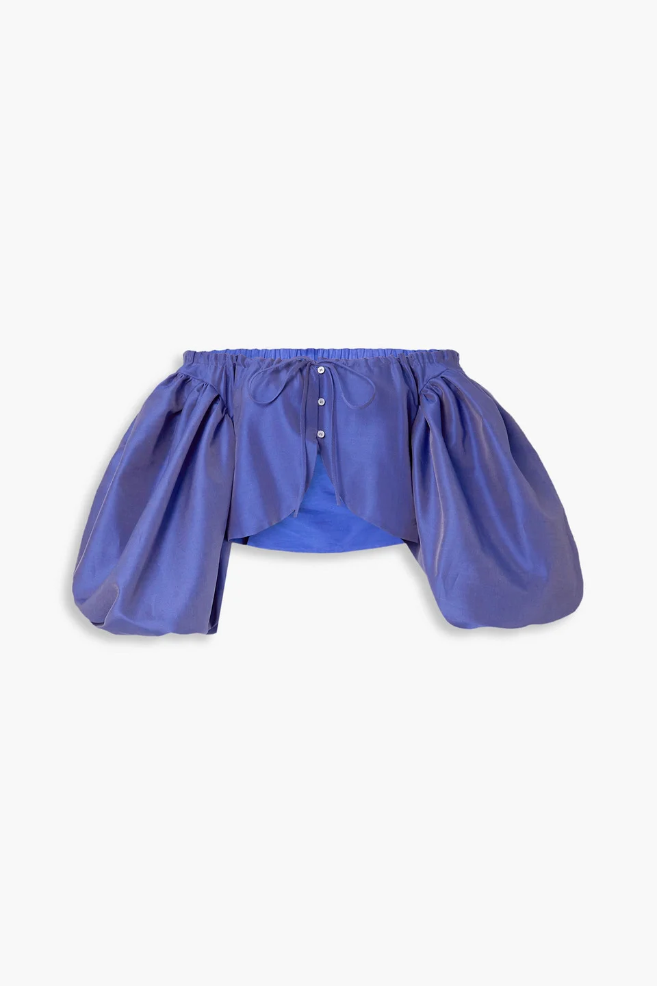 Off-the-shoulder top cotton and silk-blend cropped puffed sleeves elasticated cuffs ties at front button fastenings through front fully lined mid-weight, non-stretchy fabric dry clean made in italy Rosie Assoulin's 'Floaties' top is defined by its dramatic, oversized sleeves. It's been made in Italy from lustrous cotton and silk-blend in a beautiful 'Ocean Blue' shade and has a cropped, tulip hem. Wear yours with high-waisted pants and mules. 84% Cotton 16% Silk Product Code 1647597321840130