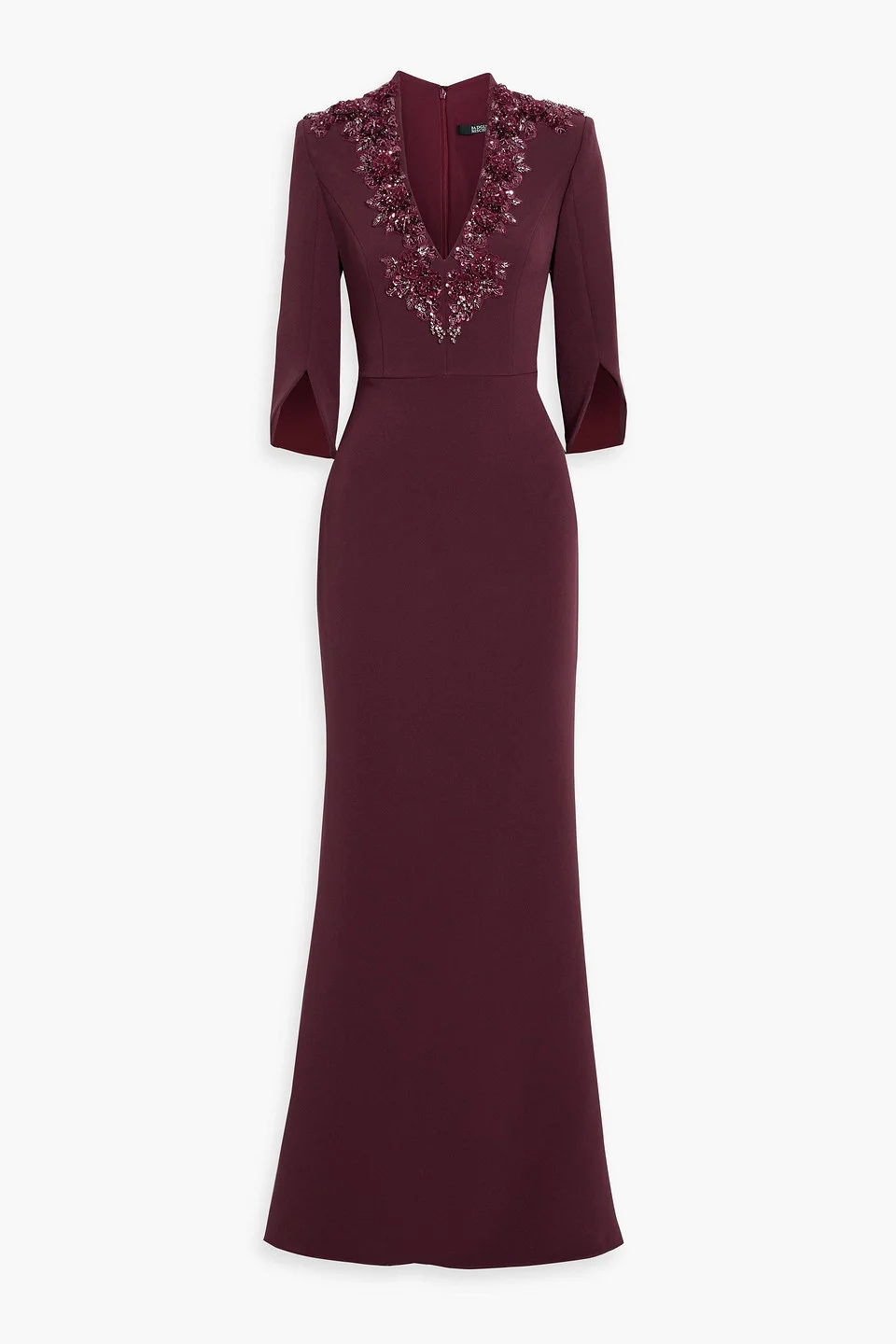 Catch eyes all night in this intricately embellished floor-sweeping design gown crepe floral appliques crystals shoulder pads slit sleeves concealed hook and zip fastening at back fully lined mid-weight, slightly stretchy fabric dry clean imported 97% Polyester 3% Spandex Product Code 46376663162965705