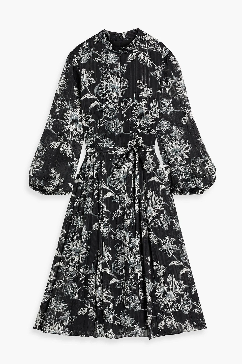 Dress metallic floral-print jacquard pleated cutout detachable waist tie elasticated cuffs concealed hook and zip fastening at back lightweight, non-stretchy fabric dry clean imported 100% Polyester Product Code 1647597356021886