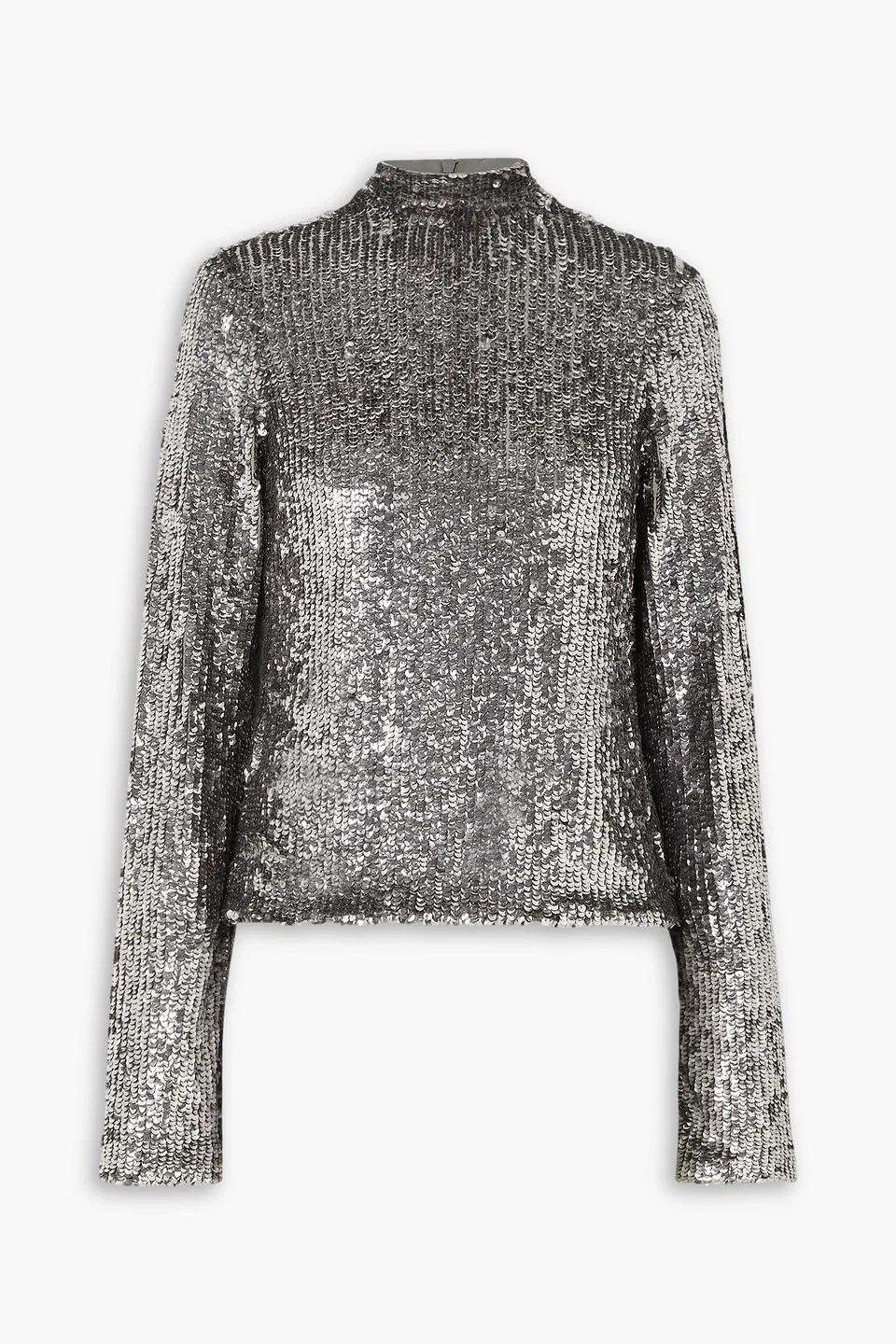 Turtleneck top stretch-tulle sequins concealed zip fastening along back fully lined lightweight, heavily embellished fabric dry clean imported Interior's 'Frances' top is designed to catch light from every angle. Made from stretch-tulle saturated with sequins, it has a chic turtleneck and elongated, flared sleeves. Wear yours with tailored pants and equally sparkly accessories. 80% Lycra® 20% Viscose Product Code 1647597346323603