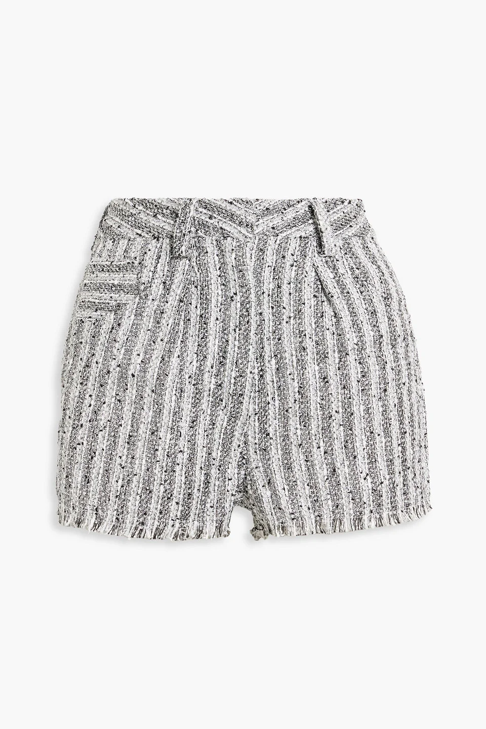 Shorts striped metallic tweed frayed trims belt loops high-rise cut five pockets concealed hook and zip fastening at front mid-weight, non-stretchy fabric dry clean imported 32% Cotton 27% Polyester 24% Acetate 9% Metallic fiber 8% Polyamide Product Code 1647597356998885