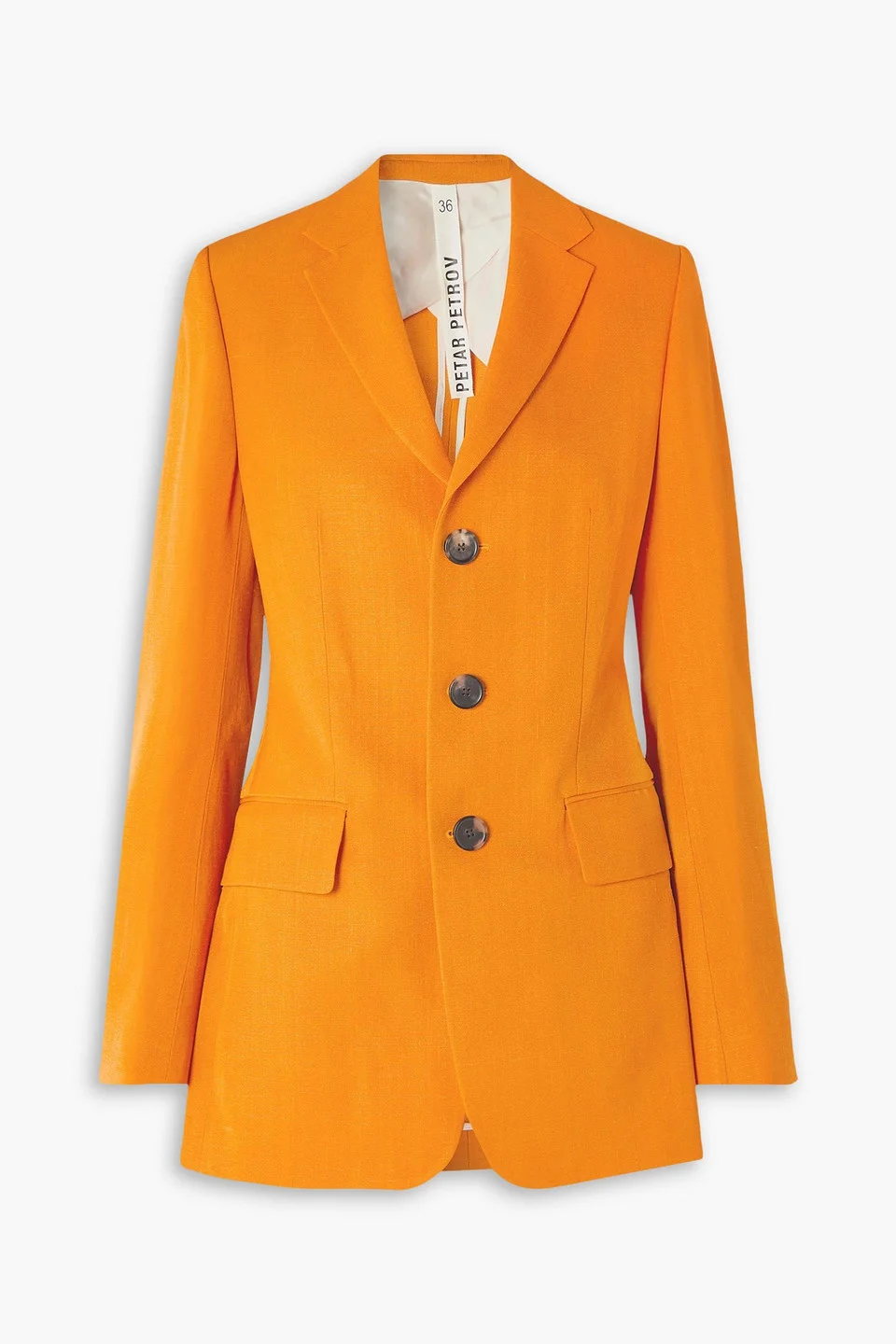 Blazer grain de poudre oversized shoulder pads buttoned cuffs two front flap pockets button fastenings through front dual back vents mid-weight, non-stretchy fabric dry clean imported Peter Petrov's 'Irit' blazer is made from burnt-orange grain de poudre – the striking colorway emits pure joy. It's designed in an oversized, single-breasted silhouette with padded shoulders and has a smooth lining for easy layering. 58% Viscose 42% Silk Product Code 1647597346471001