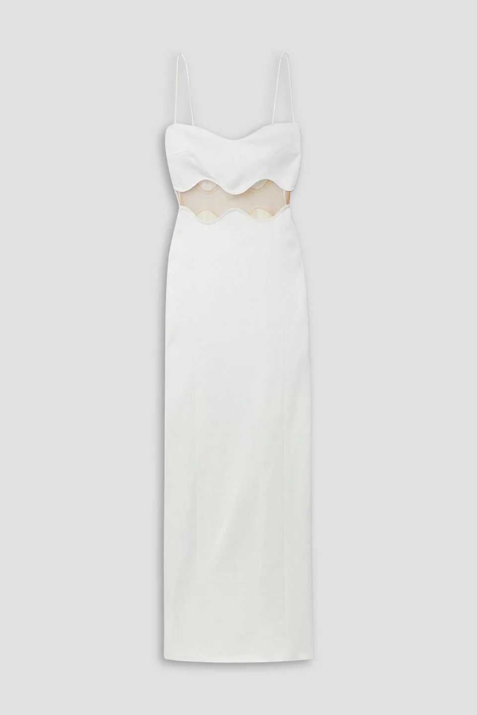 Dress mesh knitted paneled scalloped trims side split concealed hook and zip fastening at side fully lined mid-weight knit dry clean made in uk Galvan's 'Isola Bella' dress is a perfect option for all pre-nuptial events. Designed for a close fit, it's made from knitted fabric and has a center cutout with a beige mesh overlay. The barely-there straps frame the romantic sweetheart neckline beautifully. 96% Viscose 3% Polyamide 1% Elastane Product Code 1647597351737188