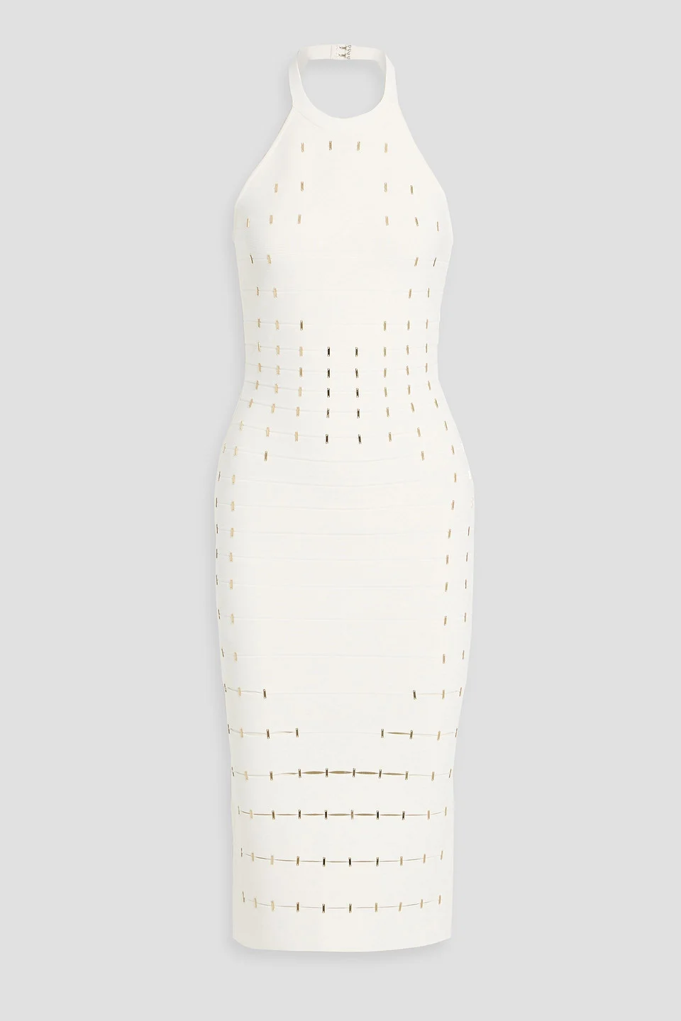 Dress bandage crystals back slit concealed hook fastenings at neck concealed hook and zip fastening at back mid-weight, sculpting fabric dry clean imported 90% Recycled rayon 9% Nylon 1% Spandex Product Code 46376663162965752