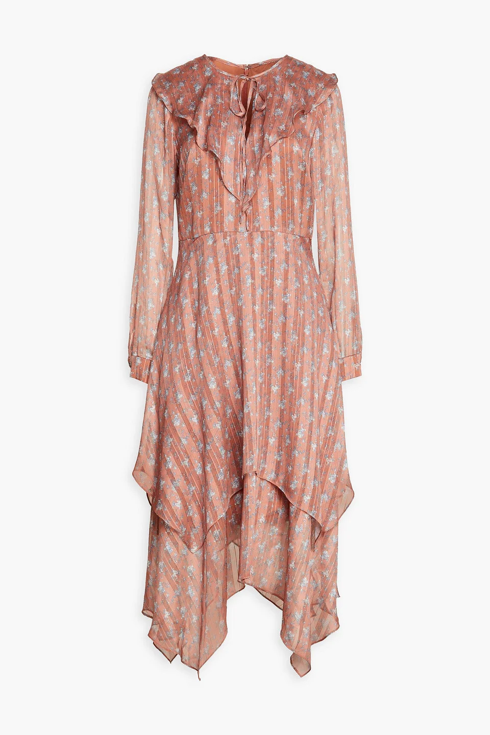 Dress floral-print jacquard metallic trim layered buttoned cuffs fully lined handkerchief hem concealed hook and zip fastening at back tie-fastening keyhole at front non-stretchy fabric with stretchy lining lightweight fabric dry clean imported 100% Polyester Product Code 1647597290993583