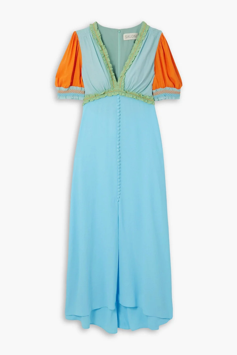 Dress color-block crepe button-embellished smocked concealed hook and zip fastening at back partially lined mid-weight, non-stretchy fabric dry clean imported Saloni is so fond of its 'Lea' dress that it reinvents it in different prints and lengths each season. This color-blocked version is cut from crepe and traced with smocked ruffles at the sleeves and bust. It's the perfect summery accompaniment to al fresco meals and celebrations. 58% Rayon 42% Viscose Product Code 1647597348176030