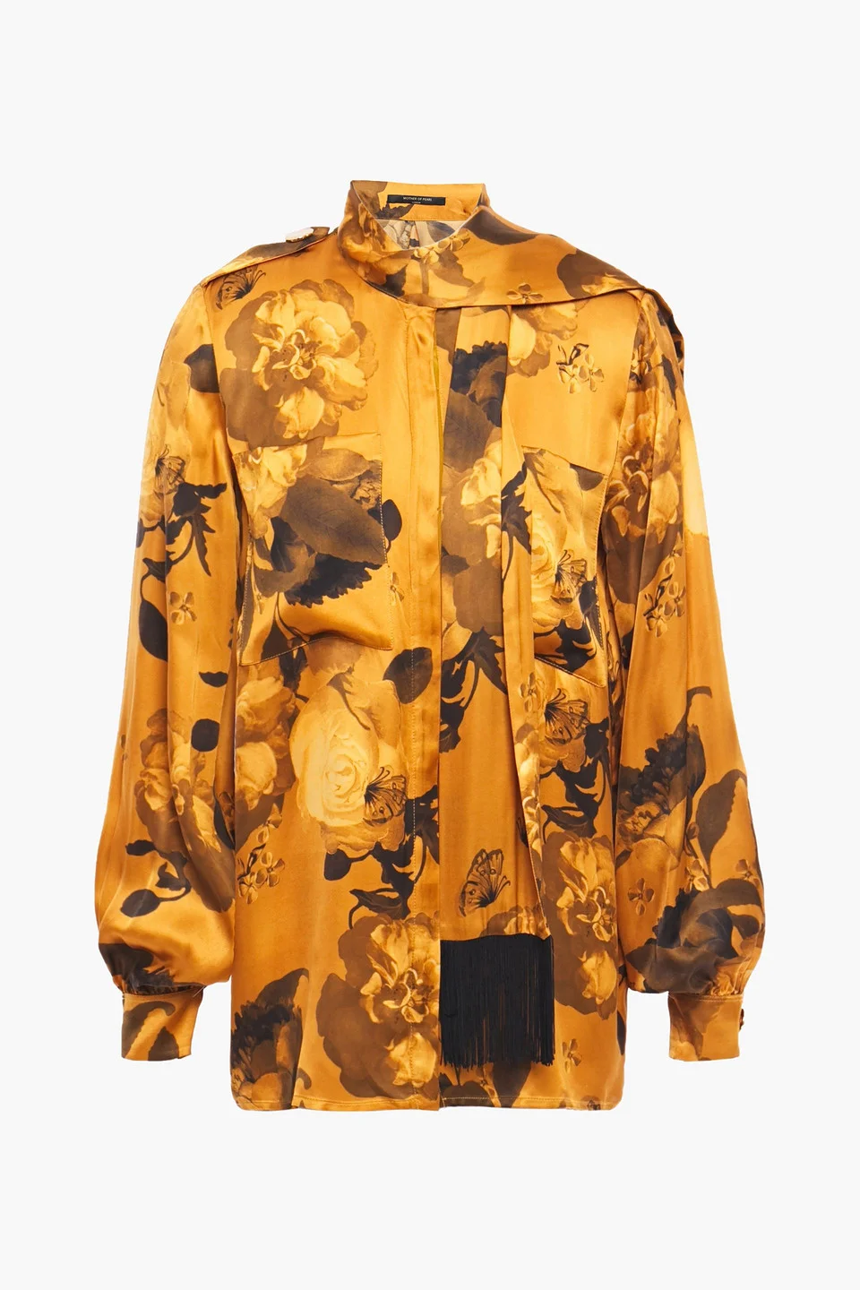 Blouse floral-print satin fringed ties pleated back snap-fastening epaulettes neckties snap-fastening cuffs breast pockets concealed snap fastenings through front non-stretchy fabric mid-weight fabric dry clean imported 100% Viscose Product Code 29012654081491525