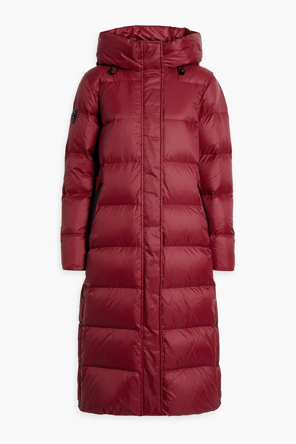 Coat quilted shell logo-appliqued leather trims drawstring hood knitted cuffs snap-fastening hem duck down and feather filling concealed snap and zip fastenings through front mid-weight, non-stretchy fabric dry clean imported 100% Nylon Product Code 1647597358195437