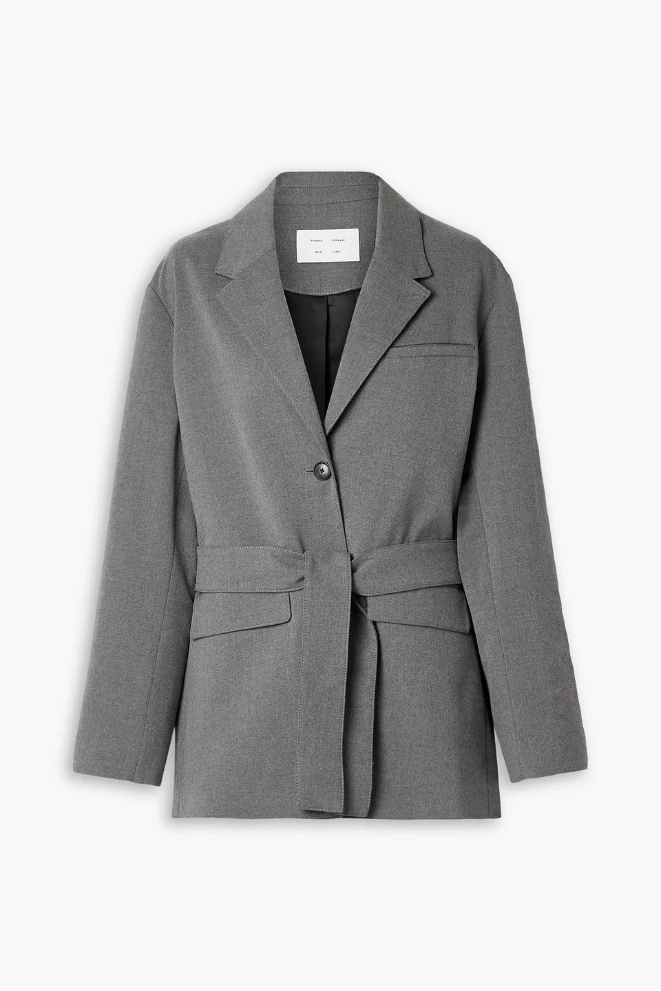 Blazer flannel detachable waist tie buttoned cuffs front flap pockets breast pocket button fastenings along front fully lined mid-weight, non-stretchy fabric dry clean imported 65% Polyester 33% Rayon 2% Spandex Product Code 46376663163070437