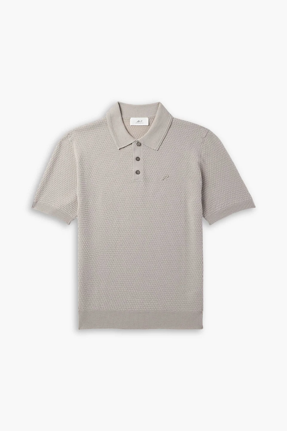 Polo shirt merino wool textured-knit mother-of-pearl buttons ribbed trims embroidered logo short sleeves button fastenings along front mid-weight knit machine wash or dry clean made in italy 100% Merino Wool 0% Trochus Niloticus (farmed): Indonesia Product Code 46376663163068707