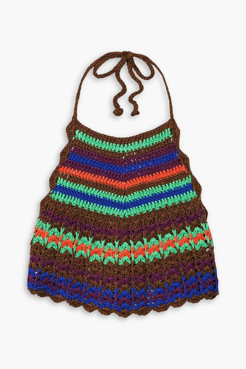 Top striped cotton crochet-knit cropped halterneck open back scalloped hem ties at neck ties at back mid-weight open knit hand wash or dry clean imported Miguelina's Pima cotton 'Malen' top is lovingly handmade, supporting local communities and preserving time-honored traditions. It's patterned with colorful stripes and has an open back with adjustable halterneck ties. The cropped hem pairs perfectly with high-waisted pants. 100% Cotton Product Code 1647597348053122