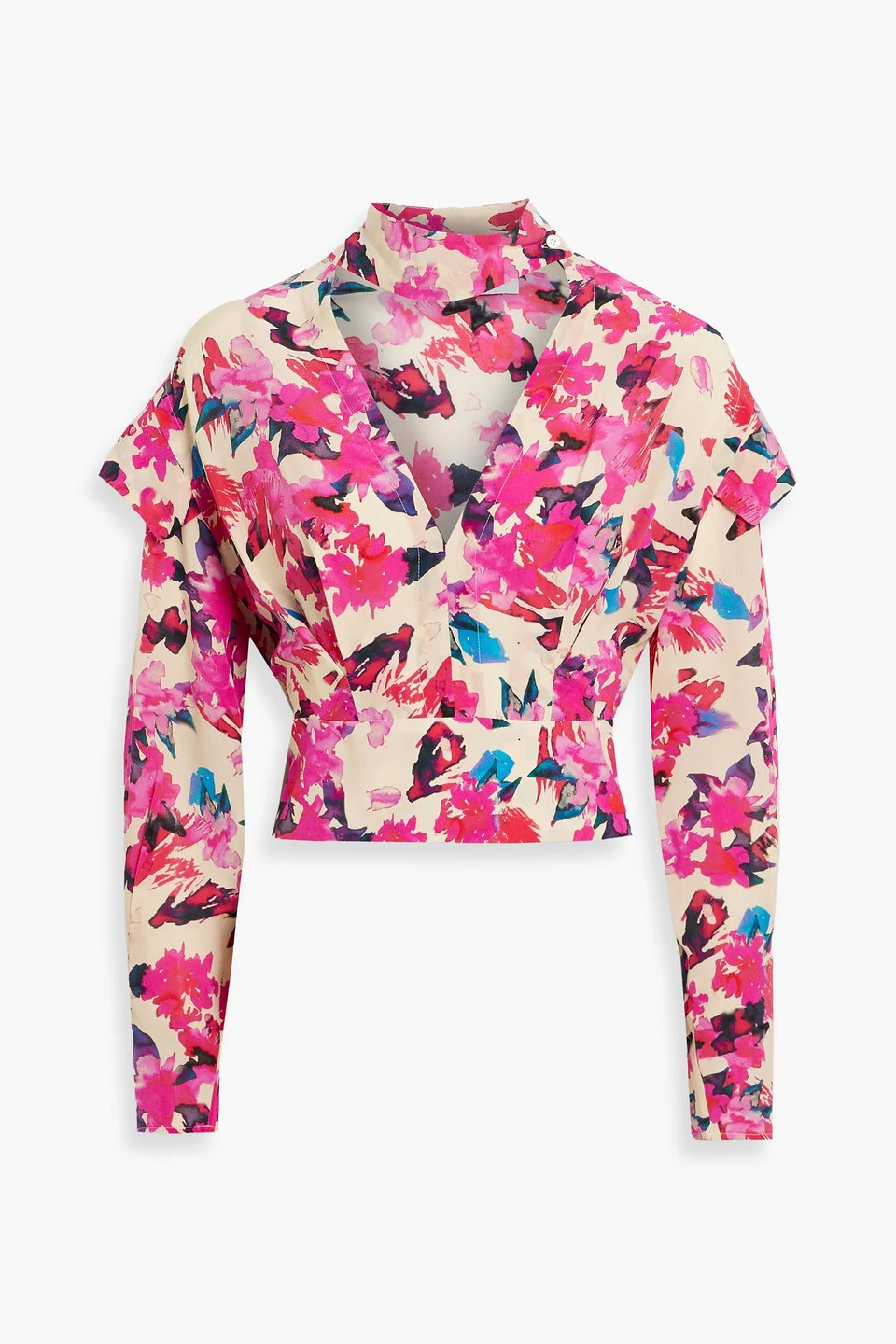Top floral-print silk-crepe cutout cropped ruffled button fastening at neck zip fastening along side lightweight, non-stretchy fabric dry clean imported 100% Silk Product Code 1647597357114664