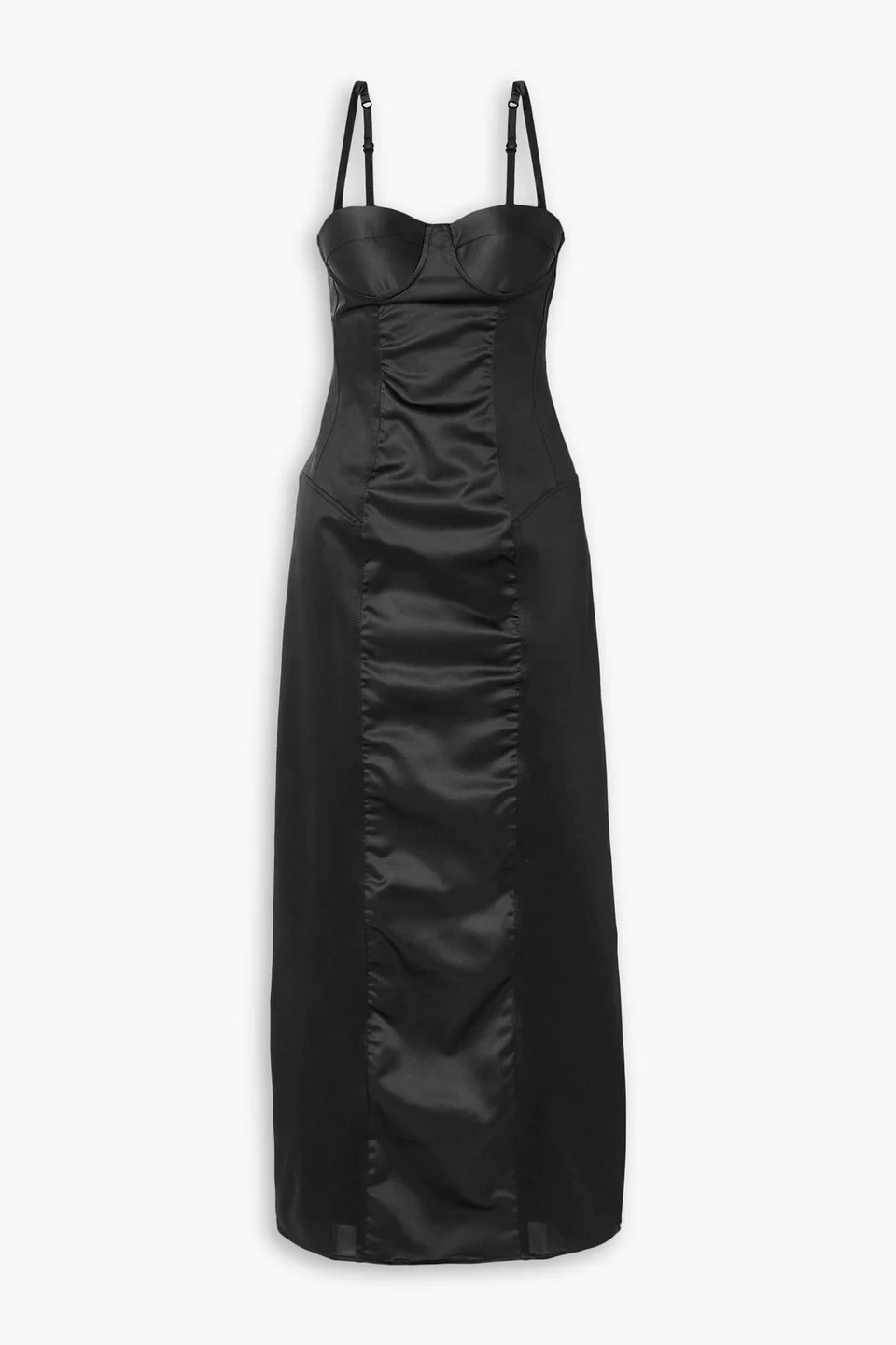 Dress satin crepe paneled adjustable straps back split concealed hook and zip fastening at back mid-weight, slightly stretchy fabric machine wash or dry clean made in italy Rosamosario's 'My Nights' dress draws on the glamour of lingerie and couture. It's cut from black crepe for a figure-sculpting fit and detailed with a tonal satin panel through the front. Style it with statement jewelry and strappy heels for your next event. 95% Viscose 5% Elastane Product Code 1647597348942971
