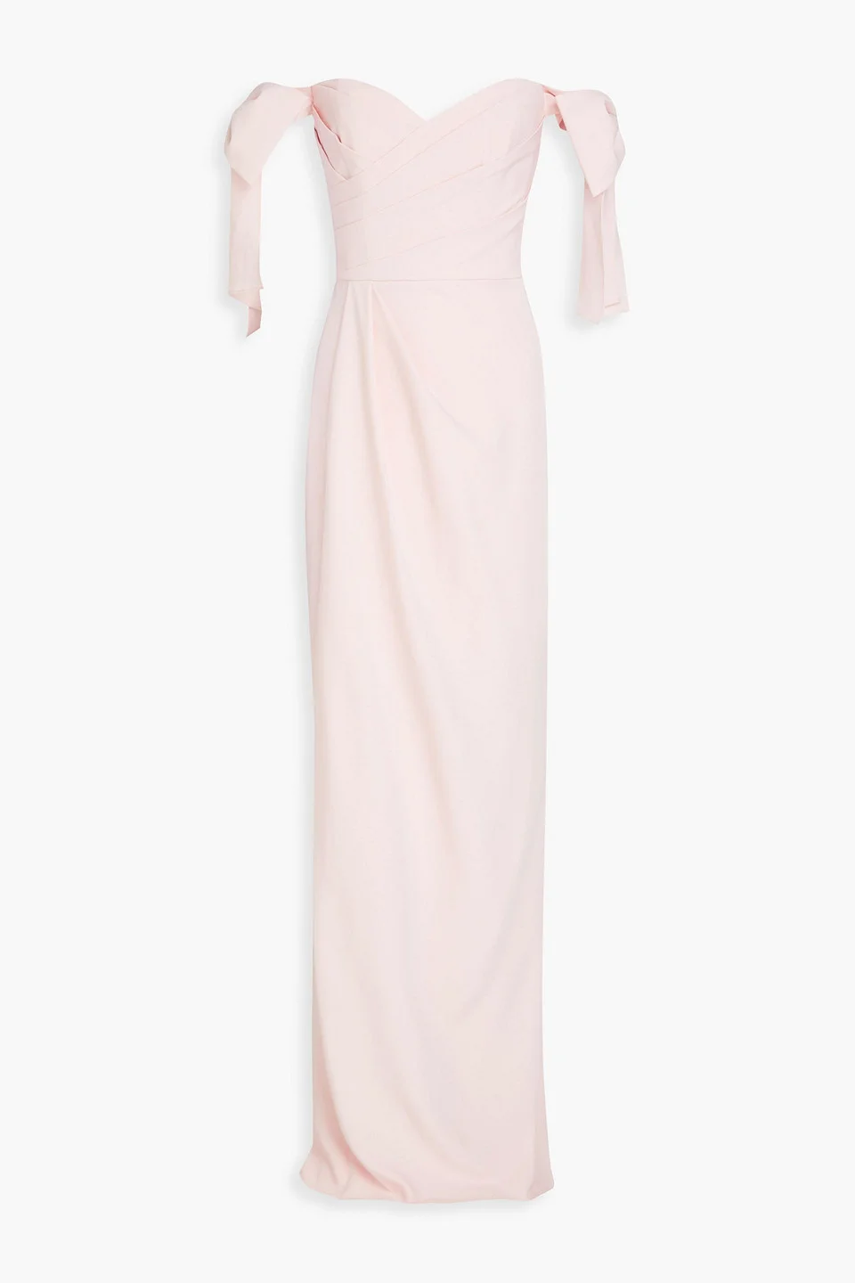 Designed to frame your decolletage, wear yours with swept-up hair and statement earrings gown crepe bow-detailed pleated front split concealed hook and zip fastening at back fully lined mid-weight, non-stretchy fabric dry clean imported 87% Polyester 13% Spandex Product Code 1647597345606828