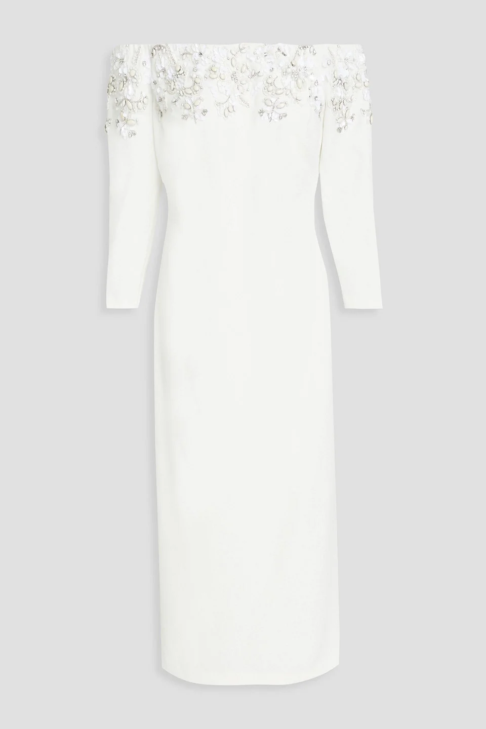 Off-the-shoulder embellished crepe midi dress