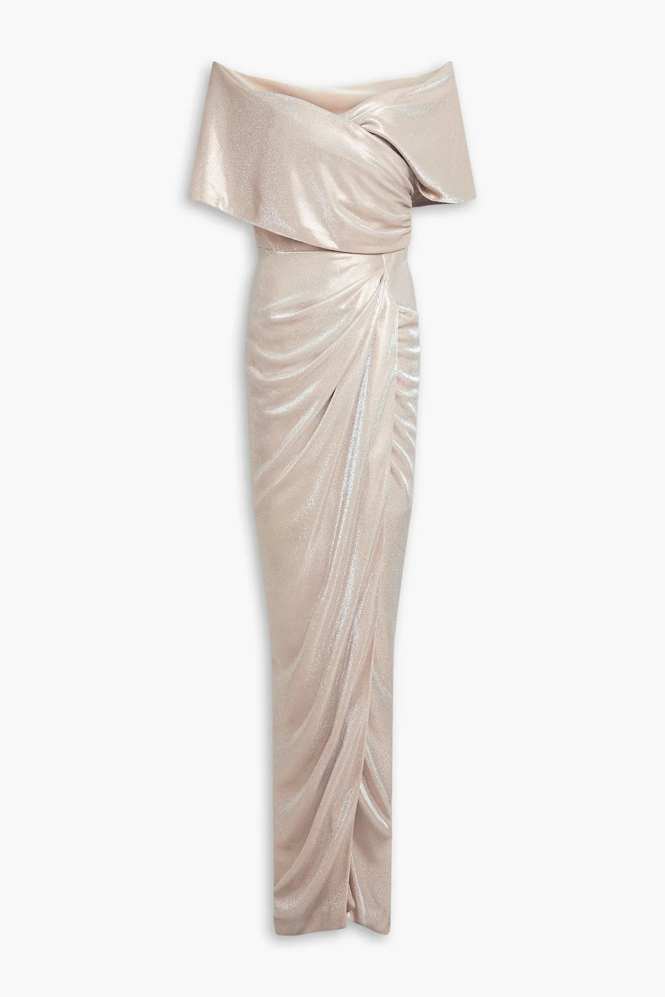 Accentuate the figure-skimming fit with sky-high heels for evening events gown metallic jersey wrap-effect draped concealed hook and zip fastening at back internal boning mid-weight, stretchy fabric dry clean imported 68% Polyamide 32% Metal Product Code 1647597354646655