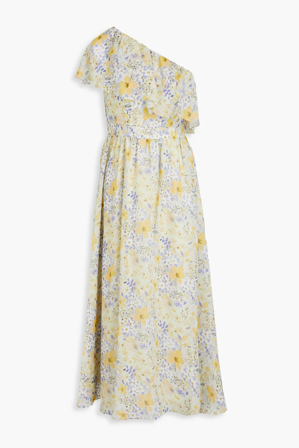 One-shoulder dress floral-print chiffon ruffled concealed hook and zip fastening at side fully lined lightweight, non-stretchy fabric dry clean imported 82% Polyester 18% Nylon Product Code 1647597337043383