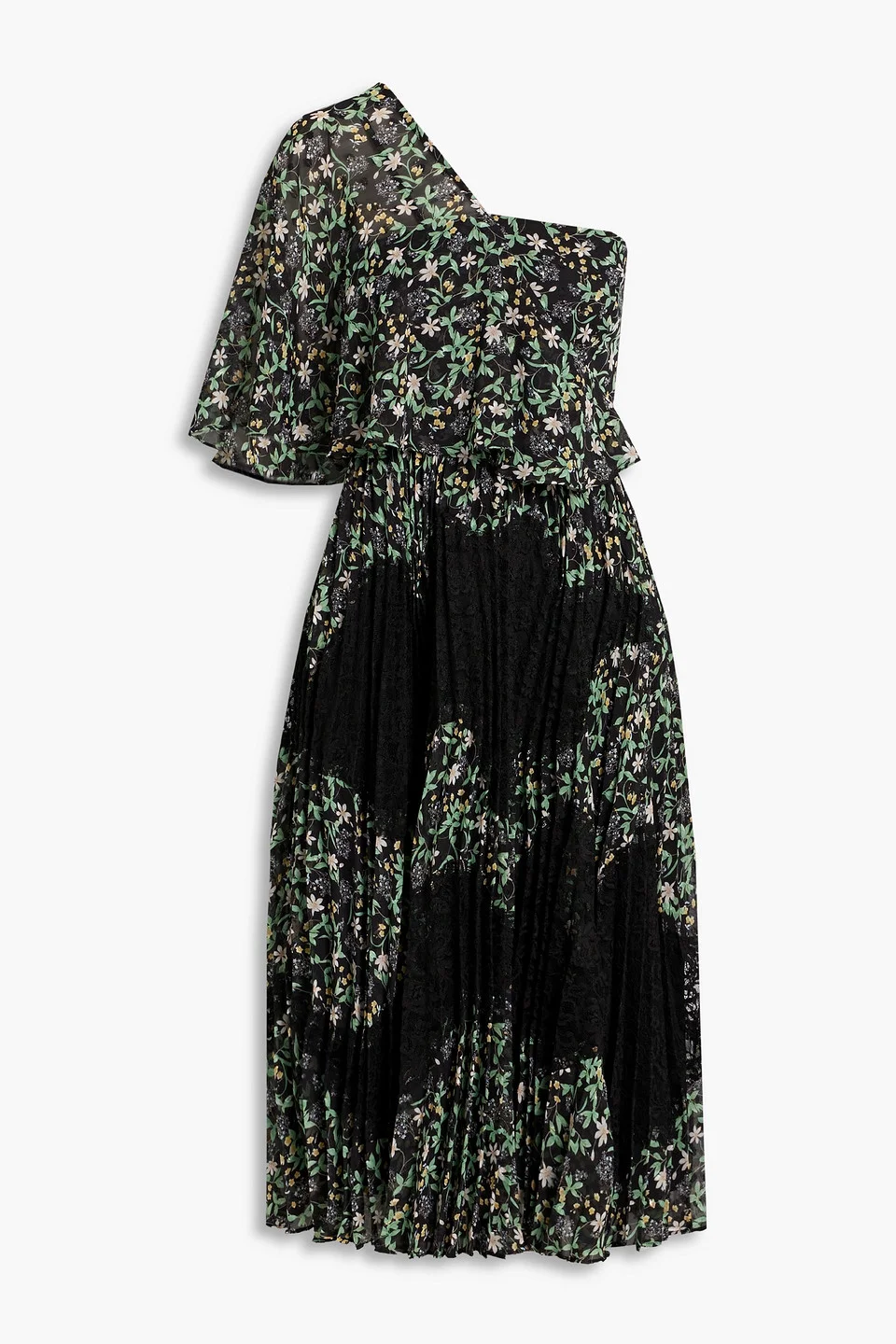 One-shoulder floral-print fil coupé and lace midi dress