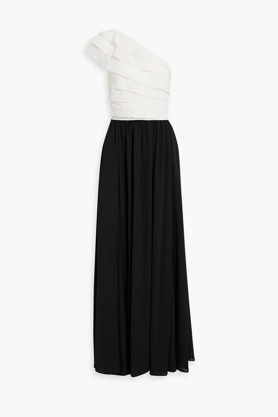 One-shoulder ruffled broderie anglaise and chiffon gown