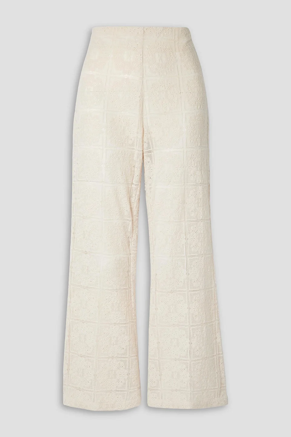 Flared pants lace pressed creases high-rise cut concealed hook and zip fastening at side mid-weight, non-stretchy fabric hand wash imported HONORINE's 'Patrizia' pants are just as breezy and comfortable as the brand's signature dresses. Made from delicate lace, this semi-sheer style has flared legs that are cropped to hit just above the ankles. Slip it on over your favorite bikini when sightseeing. 100% Nylon Product Code 1647597347688968
