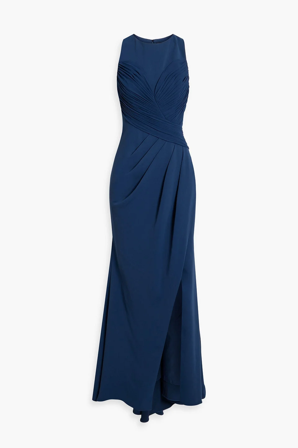 Style yours with drop earrings and towering heels for an evening spent celebrating gown crepe pleated front split fully lined concealed hook and zip fastening at back non-stretchy fabric mid-weight fabric dry clean imported 98% Polyester 2% Spandex Product Code 1647597320721045