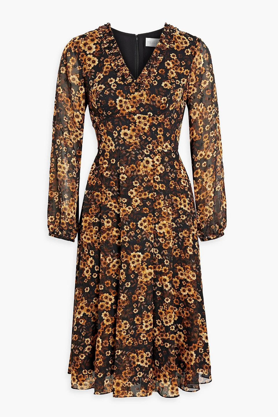 Dress floral-print metallic fil coupe chiffon ruffled trims pleated concealed hook and zip fastening at back fully lined non-stretchy fabric mid-weight fabric dry clean imported 100% Polyester Product Code 1647597327270492
