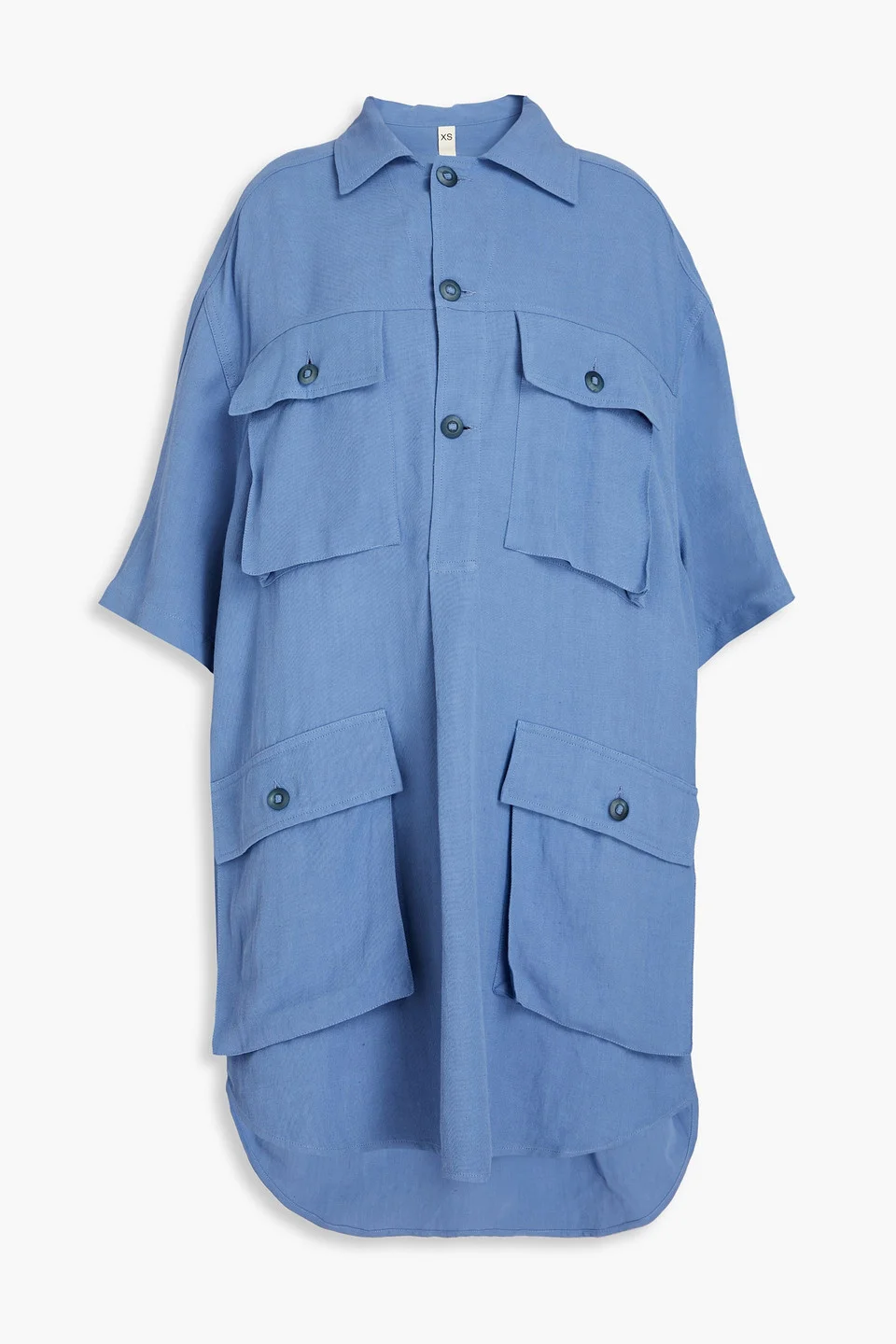 Shirt dress twill pleated breast pockets two front flap pockets dipped back hem button fastenings along front mid-weight, non-stretchy fabric dry clean imported 64% Viscose 36% Linen Product Code 1647597329515888