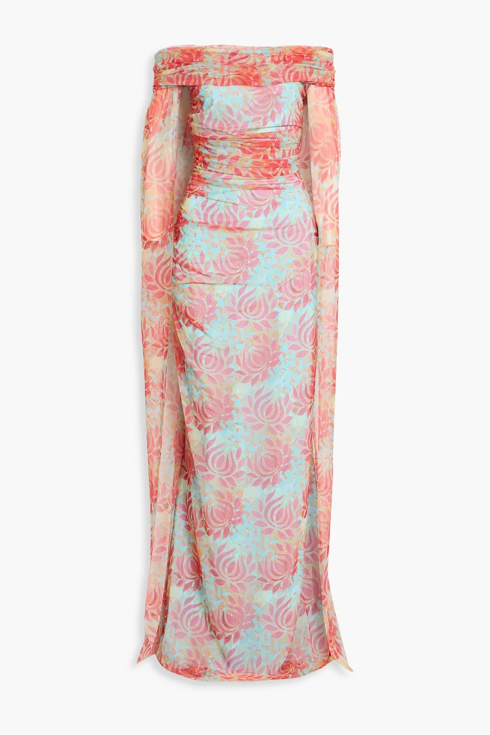 Rikyu off-the-shoulder cape-effect floral-print stretch-mesh gown
