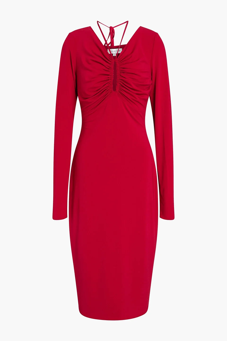 Dress jersey neckties ruched cutout concealed zip fastening along side fully lined stretchy fabric mid-weight fabric imported 94% Polyester 6% Spandex Product Code 1647597278384379