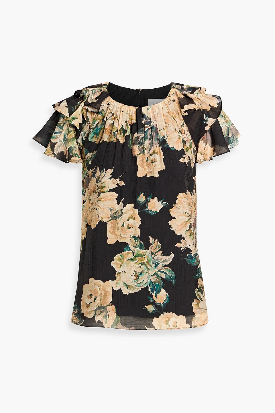 Top floral-print gauze ruffled button-fastening keyhole at back fully lined lightweight, non-stretchy fabric dry clean imported 70% Rayon 30% Nylon Product Code 46376663163082924