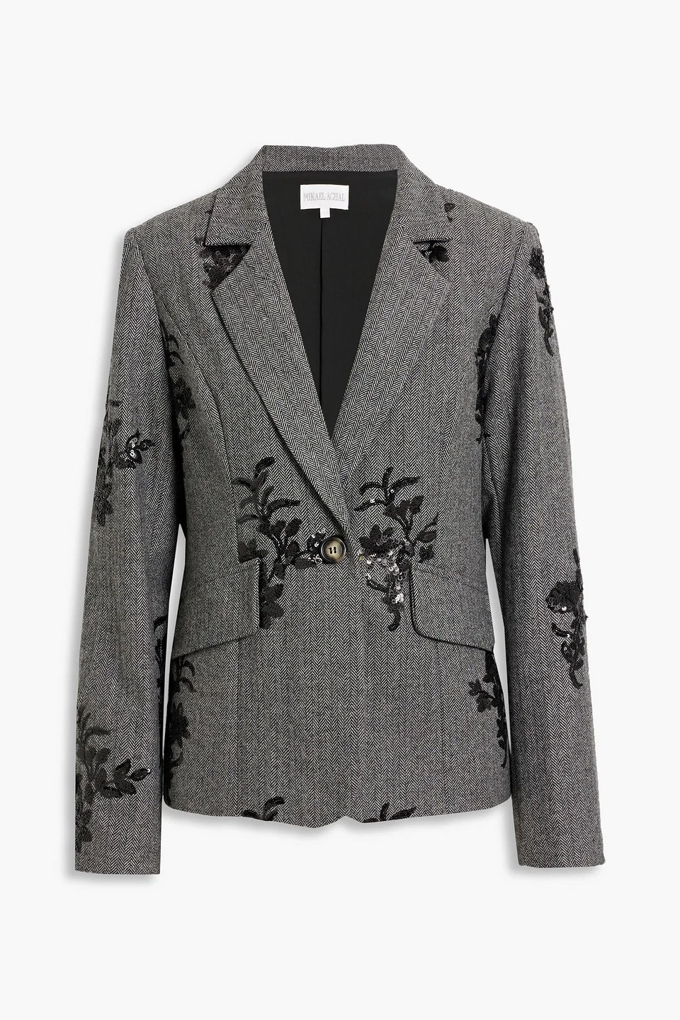 Suit herringbone tweed shoulder pads sequins front flap pockets side slit pockets back vent fully lined one-button fastening jacket; concealed hook, button and zip fastening mid-weight, non-stretchy fabric dry clean imported 90% Polyester 10% Wool Product Code 46376663162975118